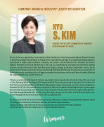 COMPANY AWARD & INDUSTRY LEADER RECOGNITION KYU S. KIM SENIOR EVP & CHIEF COMMERCIAL BANKING OFFICER BANK OF HOPE Ms. Kyu S. Kim was appointed as Senior Executive Vice President and Chief Commercial Banking Officer of the Bank as part of the strategic transformation in October 2023, responsible for oversight of all commercial lending functions across Bank of Hope’s national platform. Previously, she served as Senior Executive Vice President and Eastern Regional President of the Bank effective May 1, 2017, and was responsible for oversight of all commercial lending functions and retail branches in New York, New Jersey, Virginia, Georgia and Alabama. Before that, she was Senior Executive Vice President and Head of Community Banking of the Bank effective July 29, 2016, and was responsible for leading the business operating units of all legacy commercial lending teams and the retail branch network following the merger of BBCN Bank and Wilshire Bank. A 25-plus year veteran of the Bank, Ms. Kim was promoted to Senior Executive Vice President in May 2013 and served as Chief Operating Officer from August 2013 through July 2016. Previously, she served as Executive Vice President and Chief Commercial Banking Officer of BBCN Bank following the merger of Nara Bank and Center Bank completed on November 30, 2011. Ms. Kim joined the former Nara Bank in 1998 and is credited with building the Bank’s eastern region presence from the ground up, most recently serving as Executive Vice President and Eastern Regional Manager from April 2008 through November 2011. Prior to joining Nara Bank, she was Vice President and Chief Credit Officer at the former Chicagobased Foster Bank from March 1990 to September 1997. Ms. Kim received her B.B.A. in Finance from the University of Wisconsin, Oshkosh. She completed the Graduate School of Banking at the University of Wisconsin, Madison and the ABA Stonier Graduate School of Banking at the University of Pennsylvania. Ms. Kim also earned her Wharton Leadership Certificate from The Wharton School Aresty Institute of Executive Education.